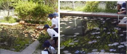 4年生が中庭で樹木やその周りの生き物を観察していました。これから、1年を通し、季節の変化と生き物の様子の移り変わりを観察します。木の周りに何か生き物がいないか探したり、見つけた蟻の動きを観察したりしていました。十字池では、ザリガニが池の底で動いているのを見つけ、池の水温を先生と一緒に測っていました。