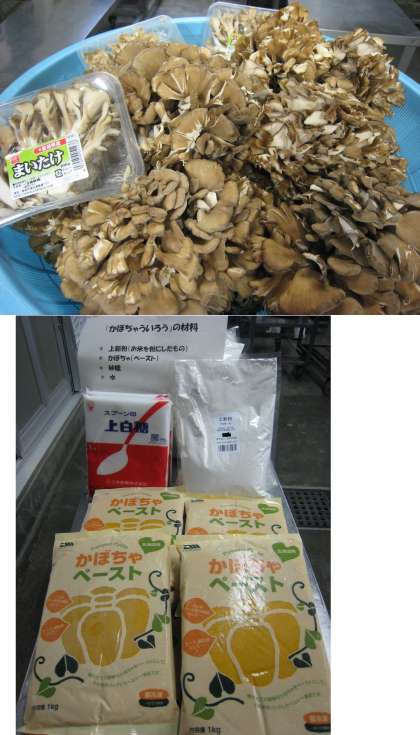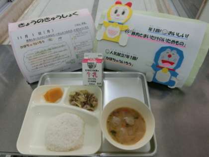 今日のメニューは「豚肉とまいたけのいためもの(年1回)、いわしのつみれ汁(年1回)、かぼちゃういろう(年1回)、ごはん、牛乳」でした。