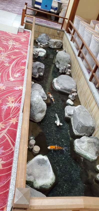 宿舎のロビーの写真です。毎年、この鯉が泳ぐ様子に感動してくれる子がいます。