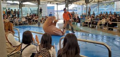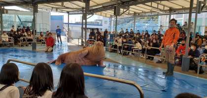 午前11時、セイウチのパフォーマンスショーが始まりました。なかなかの芸達者でいつも感心させられます。子どもたちもどおり喜んでいました。