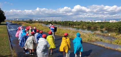堤防に上って、城北わんどや千人つかについて教えてもらっています。