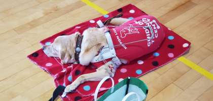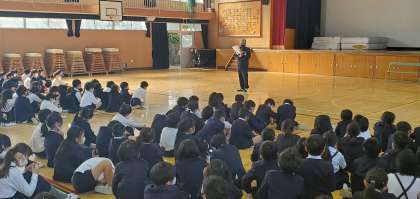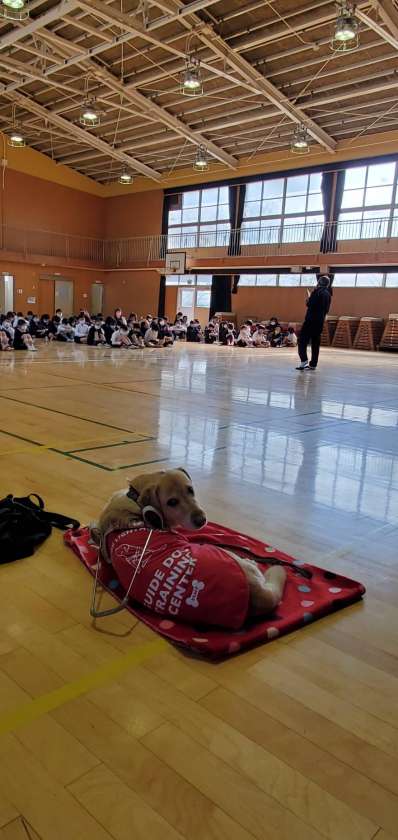 今日の2・3時間目、PTAの方にもご尽力いただいて盲導犬体験を実施しました。講師の方がお話している間も、おとなしくじっとしている姿に感心している子もいました。