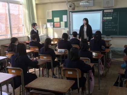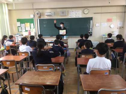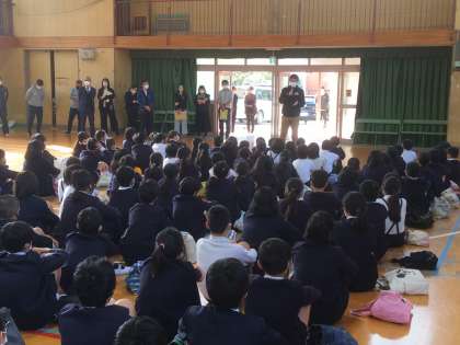 今日は6年生が午後から授業体験をしに、高倉中学校に出かけています。はじめに今日の流れ等について体育館で説明を受けた後、それぞれの教室に分かれました。