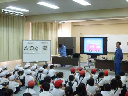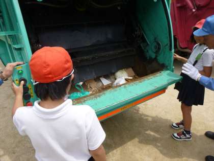4年生の学習の一環として、環境局の方を講師に招き「パッカー車体験」を行いました。