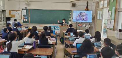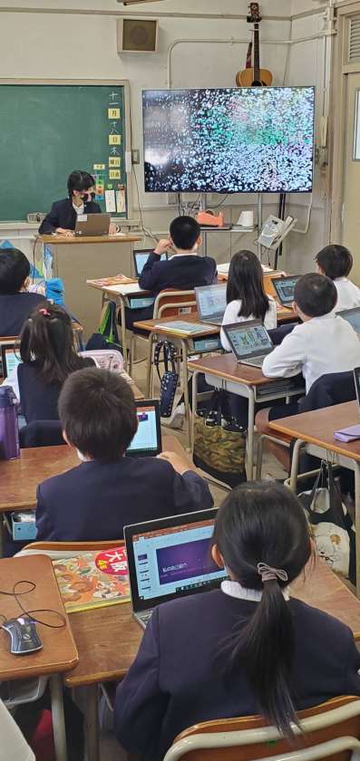 ご覧の写真は4年生がパワーポイントを使って、自己紹介する画面を発表している様子です。背景を工夫したり、アニメ—ションを使ったりして、楽しい作品を作ることができていて驚きました。やるなぁ、4年生!!