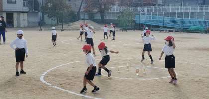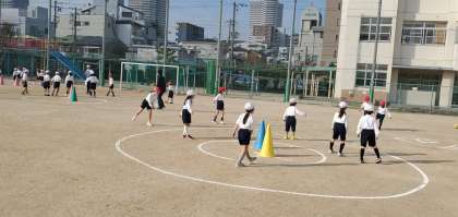 ご覧の写真は今日の1時間目、1年生の体育の授業の様子です。攻めと守りに分かれ、的をボールで蹴って倒すゲームをしています。にぎやかな声が聞こえてきて楽しいです。