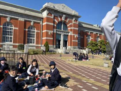 見学を終えて、お弁当を食べています。お昼になり、かなりあたたかくなりました。この後、帰校する予定です。