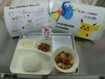人気献立『じゃこ豆』と季節の『かぶ(鳥取県産)』の和風献立に舌つづみを打ちました!(12/3の給食)