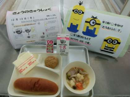 今日のメニューは「豆腐ハンバーグ(年1回)、カリフラワーのスープに、スライスチーズ、黒糖パン、牛乳」でした。