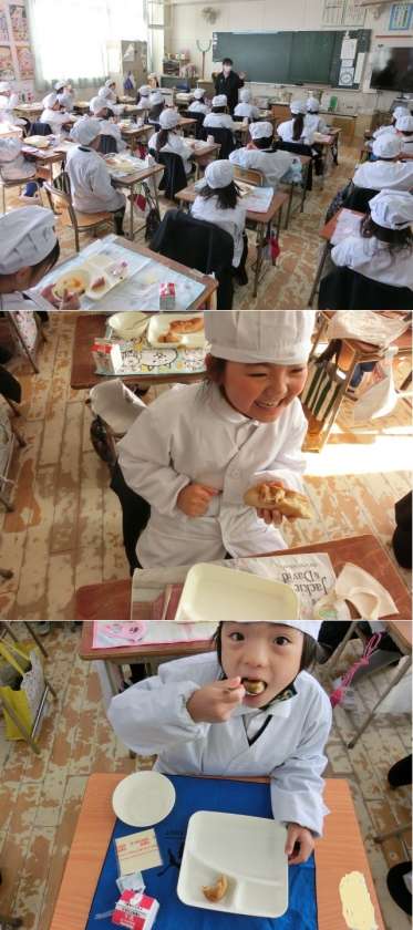 初めて高倉小の手作り「とうふハンバーグ」を味わった1年生の教室で・・・
