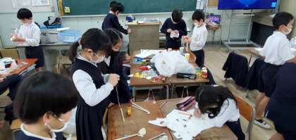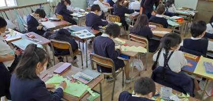 高倉小学校では毎年、2年生が1年生を「おもちゃランド」に招待するという取り組みを行っています。ご覧の写真は2年生がその準備をしている様子です。みんな1年生に喜んでもらおうと一生懸命取り組むことができていて感心します。