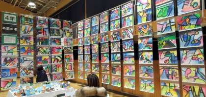 続いて4年生の作品です。4年生は自分の名前を漢字やひらかな等、線でデザインし、彩色した「名前の道」という絵画を、また「本からとび出した物語」というテーマで作成した工作を出品しています。