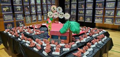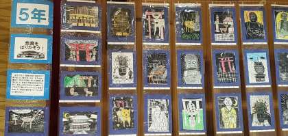 まず5年生。5年生は奈良に遠足に出かけたことから「奈良をほりだそう」をテーマに木版画を、また工作はそれぞれ顔やポーズを工夫したシーサーを展示しています。