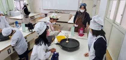 今日の2時間目、なかよし学級のクリスマスパーティが行われました。ご覧の写真はその中のプログラムのひとつ、家庭科室でホットケーキづくりをしている様子です。先生にお手伝いしてもらいながらではありますが、どのグループのも美味しそうなホットケーキが焼きあがりました。