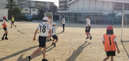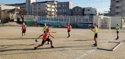 ご覧の写真は6年生がハンドボール型のゲームをしている様子です。ルールはハンドボールをやや易しくしたもので、ボールも柔らかい物を使用しています。チームとしての動きや声のかけ方など、さすが6年生と思わせる面が随所に見られます。