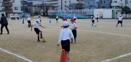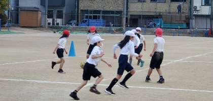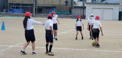 3年生の体育科学習の様子です。運動場では、なわとびとご覧いただいているサッカーを基に簡易化した「ラインサッカー」を学習しています。