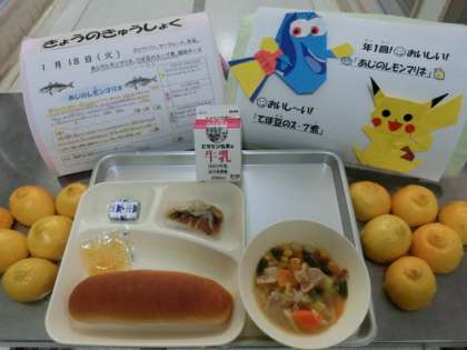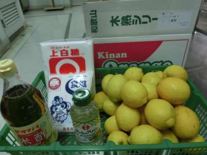 給食では1995年2月〜より安全性の高い国産のものを使用し始めました。それ以前はアメリカ産を使用(年中使用可)していましたが、国産品となり旬の時期(1〜2月)のみ味わっています。今日は和歌山県産のレモンを3.4kg(25個)使用し、マリネ液を作りました。爽やかな香り豊かなレモン汁をしぼったものを盛り付け見本の所に飾ることで、児童にはインパクトがあったようです。