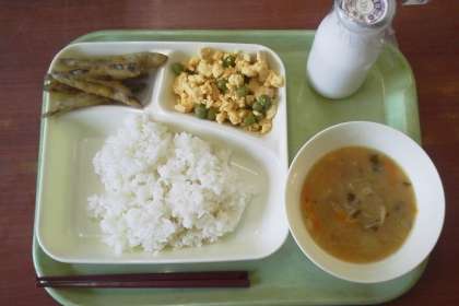 今日の給食献立は、きびなごてんぷら みそ汁 えんどうの卵とじ ごはん 牛乳です。本日は卵の個別対応献立です。