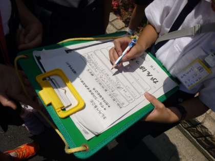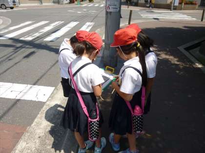 校区探検は社会科の授業の一環としておこなわれ、子どもたちは慣れない地図をみながら自分たちの「おすすめスポット」をさがしていました。