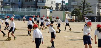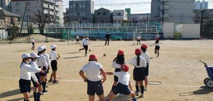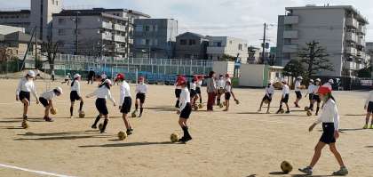 ご覧の写真は今日の5時間目、4年生が運動場でサッカー型ゲームの学習をしている様子です。朝の内は運動場がまだぬかるんでいましたが、2時間目が終わった頃には乾きだし、休み時間にも外で遊ぶことができるようになりました。