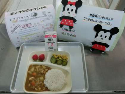 初登場の『チキンレバーカレーライス』と赤く、甘く、愛らしい果物『いちご』にニコニコ笑顔でした!(2/22の給食)