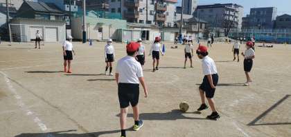 今日の5時間目、5年生がサッカーの学習をしている様子です。