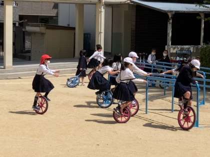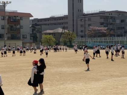 一輪車を練習する子や新しいクラスの友達と運動場で走り回って子もいます。