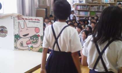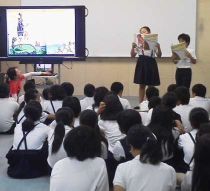 図書室では5年生対象に「ふしぎなキャンディやさん」と「ふくわうち おにもうち」を 多目的室では6年生対象に電子黒板を使って「ふなひき たらあ」を発表しました。