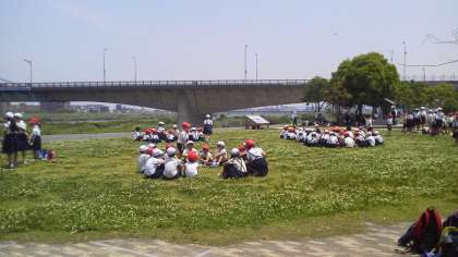 昭和20年6月7日の大阪大空襲の日、高倉小学校には爆弾が落ち、校舎も消失、都島区でも多くの方が亡くなりました。淀川の堤防に避難した人々が機銃照射でたくさん命を落とした事、大阪大空襲で命を落とし城北公園近くで荼毘にふされた人々の冥福と平和を祈って千人塚ができた事など、私たちの身近な所で実際に起こったことです。これらを平和を守るために語り継いでいかないといけないと考えています。写真は、本年5月のキッズファミリー遠足で淀川縁で楽しく遊んでいる本校児童と千人塚の由来の碑です。高倉小学校では、本年も、様々な形で戦争の恐ろしさや平和の尊さを学習します。