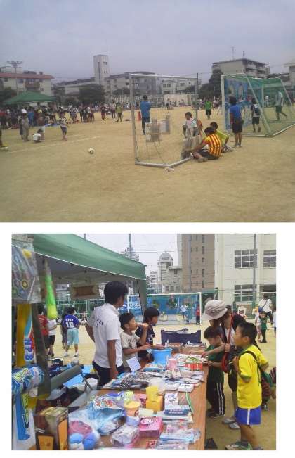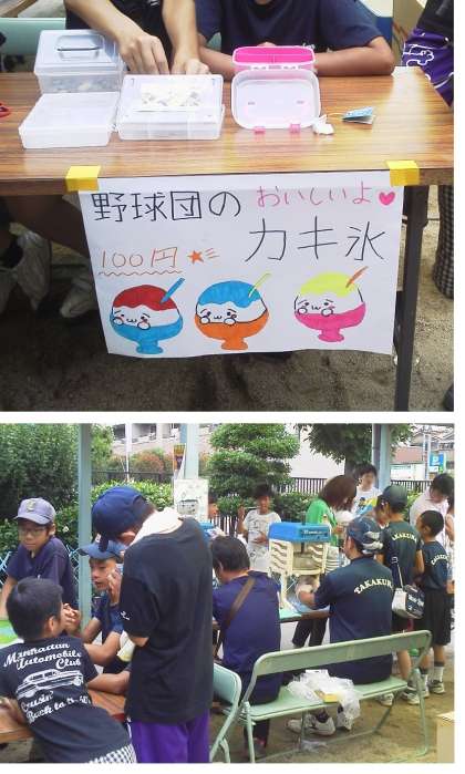 ヨーヨーつりや射的もあります。野球チームはかき氷屋さん、高倉サッカークラブはシュートをするとその点数で景品がもらえるお店でした。