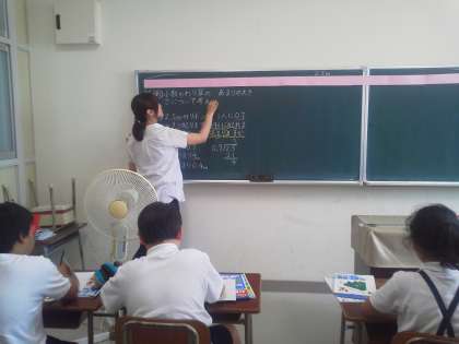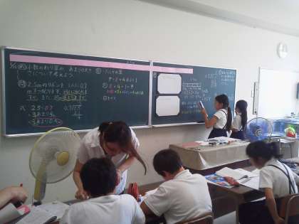 6月15日(月)5年生で習熟度別少人数学習の公開授業(授業研究会)を行いました。習熟度別少人数学習では、子どもたちのその学習内容における習熟度に合わせたわかりやすい指導が求められます。今日の学習の目標は、算数「少数のわり算」で「あまり」の意味を理解し、あまりを求めることでした。発問や板書、掲示物等が適切であったか、わかりやすかったかを授業をもとに意見交換します。余りのある少数どうしのわり算は難しい内容ですが、子どもたちは、活発に手を挙げ、発表し、一生懸命学習していました。