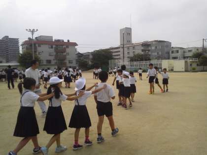さあ、ゲーム開始です。まず、ペアーの人とじゃんけんをし、負けた人が勝った人の後ろに回り肩に両手をおいて、二人で音楽に合わせて自由に歩きます。音楽がストップしたら近くのペアーとじゃんけん。負けたペアーが買ったペアーの後ろに。これを繰り返していると、とてもとても長い列が出来上がりました。最後に一番長い列はどこか、長さ比べをしました。