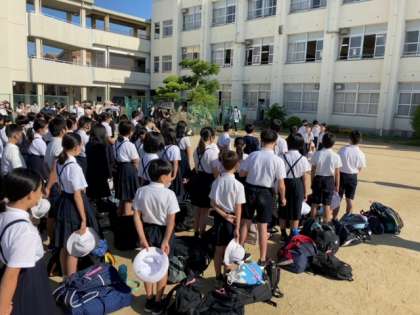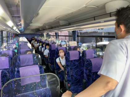 出発式を行い、7:50バスに乗ってスペイン村をめざして出発しました。