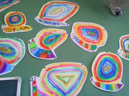 2年生になって、子どもたちは、水彩絵の具を使い始めました。その本格的作品の第一号です。パレットにいろいろな色を作って、筆で線を描きかたつむりのぐるぐる模様のある殻を描きます。美しい色彩のにじ色かたつむりが出来上がりましたね!
