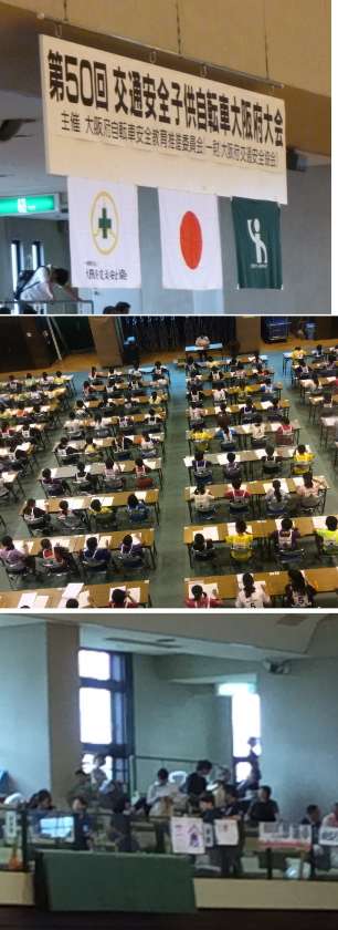 6月27日(土)第50回交通安全子供自転車大阪府大会が守口市民体育館で開催され、都島区代表として高倉小学校児童が出場しました。大阪府下の各警察署管内から代表1校が出場する大会です。共に練習を重ねた応援児童も2階席から応援ボードを使って応援しました。