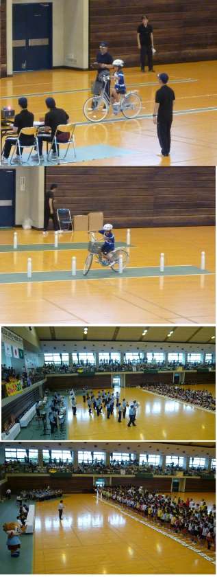次に、団体戦実技試験です。まず、模擬コースを走行します。そして、通称一本橋と呼ばれる25秒走行とスラロームです。なかなか難しいですが、練習の成果を発揮しようとどの子もがんばって挑戦していました。団体戦の次は、個人戦です。一本橋とスラロームに挑戦しました。