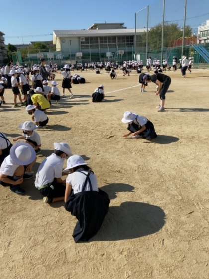 朝会後には、運動会練習でけがをしないように、みんなで石拾いをしました。