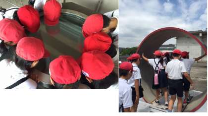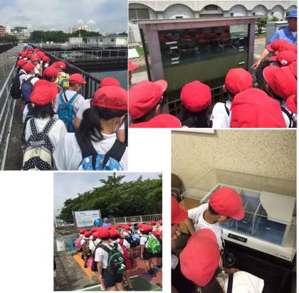 見学では、淀川から取り入れた汚れのある水がいろいろな装置を通るごとにきれいな飲み水に変化していく様子を見学しました。浄水場のみなさんが、わかりやすく説明してくださいました。高度処理した水のタンクの中をのぞくと水は本当に透明で美しくびっくりしました。太い水道管やいろいろな機械も見せていただきました。