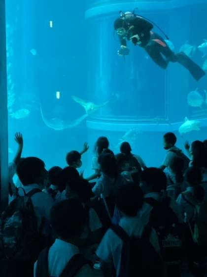 巨大な水槽をダイバーの方が掃除をしています。みんなで手を振っています。