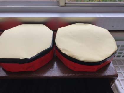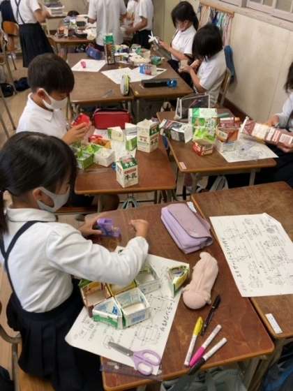 これまで集めてきた牛乳パックを活用して、運動会で踊るエイサー用のパーランクーを作っています。