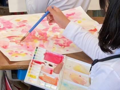 まずは3色だけを使ってにじみやはじきなどの表現方法で背景を描いていきます。