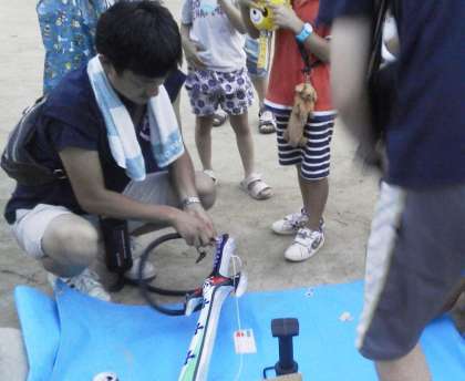 7月18日の祭礼に合わせ、高倉中央公園に地域諸団体の手作りの夜店が準備され、多くの子どもたちが家族の方といっしょに楽しんでいました。PTAも「くじびきやさん」を出店し、たくさんの子どもたちが来店しました。選んだ割り箸の先の印によって景品が決まります。空くじなしで、大きさの違う空気でふくらます景品です。店の後ろで「膨らませ隊」が控えていて、子どもたちの要望に応じて空気を注入していました。