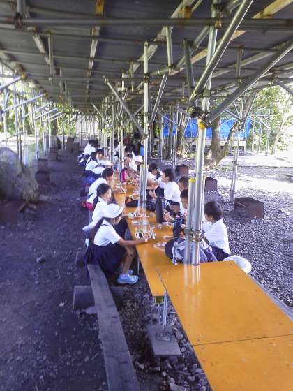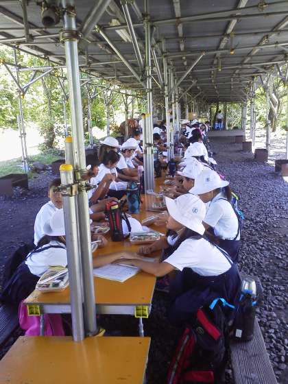 予定していた広場は高原の日差しが強いため、飯盒炊爨の場所でお弁当を食べることにしました。