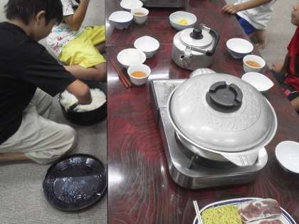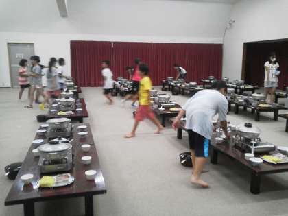 魚つかみ(あまご)のあと、入浴を終えた5年生。食事係が集合し夕食の準備です。
