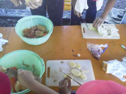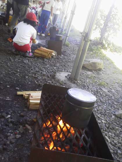 飯盒を炭火にかけて、お米を炊きます。中が見えないから心配ですね。