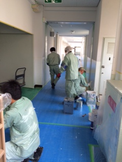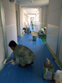 7月29日より31日の3日間の予定で、3階6年生教室前廊下を中心に壁面塗装作業を行っています。これは、管理作業員の合同作業として実施しているもので、本校だけではなく近隣の学校の管理作業員も参加して合同で作業を進めています。