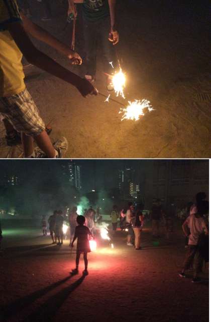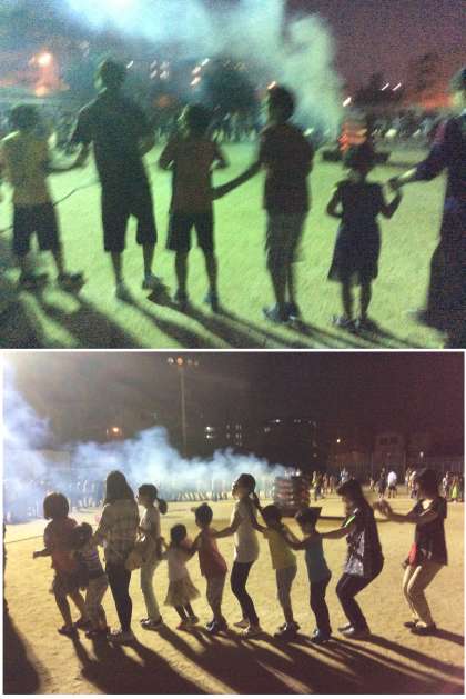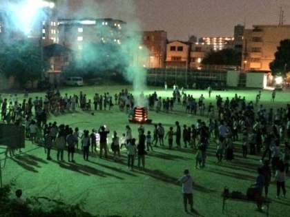 次に、町会ごとに集まって、花火です。幻想的な明かりが運動場に美しく浮かび上がりました。子ども達も大喜びです!
