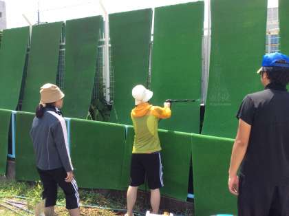 今日は、居合わせた教職員でプールサイドのマットの掃除に挑戦しました。今まで、いろいろ工夫しましたが、マットにこびりついた汚れはなかなか落ちません。そこで、高圧洗浄機の水で落としてみることにしました。マットをプールサイドの柵にかけるのも一苦労です。汗だくになりながら、取り組みました。高圧洗浄機の水をマットに近づけると汚れが水と共に吹き飛ぶようにきれいになります。掃除が終わったマットはすっかりきれいになりました。枚数が多いので一度にはできませんでしたが、明日も引き続き取り組みます。子どもたちの快適な学習環境を準備するために、夏季休業中も様々な作業に取り組んでいます。