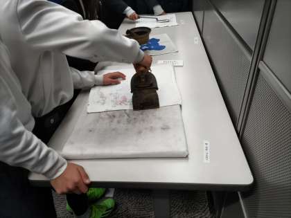 昔の道具についてクイズがあり、実際に触ってどのように使うのかなど考えています。