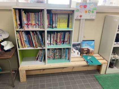 職員室前に設置した「心の本だな」ですが、管理作業員さんに台を作っていただきました。